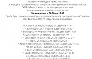 В этот день граждане получат консультации от руководства и специалистов ГУП РК «Вода Крыма» по интересующим вопросам, входящим в компетенцию предприятия.