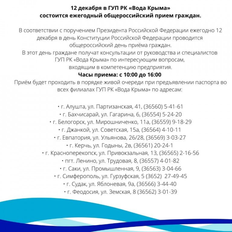 12 декабря в ГУП РК «Вода Крыма» состоится ежегодный общероссийский прием граждан.