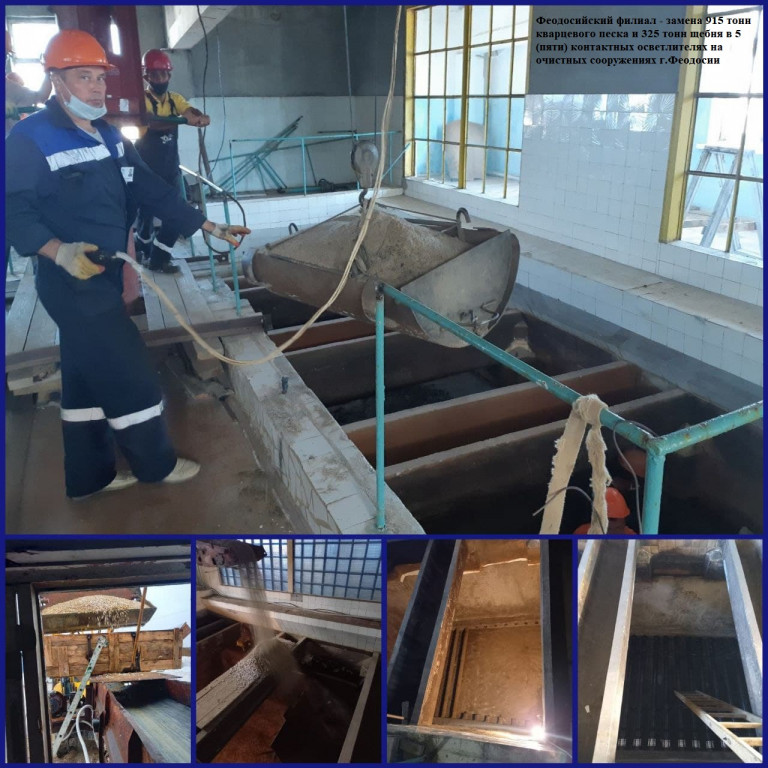- замена 915 тонн кварцевого песка и 325 тонн щебня в 5 (пяти) контактных осветлителях на водоочистных сооружениях г.Феодосии. Работы выполнены собственными силами Феодосийского филиала без привлечения специализированной техники и сторонних организаций.