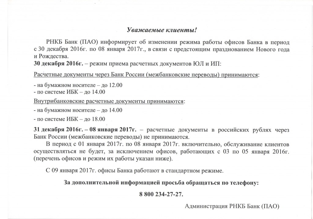 Режим работы офисов банка РНКБ в период с 30 декабря 2016г. по 08 января 2017 г., в связи с предстоящим празднованием Нового года