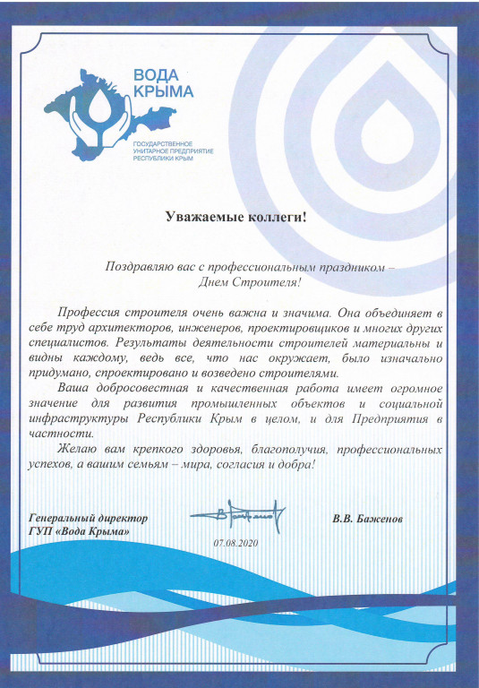 Генеральный директор ГУП РК "Вода Крыма" Владимир Баженов поздравил сотрудников Предприятия с Днём строителя.