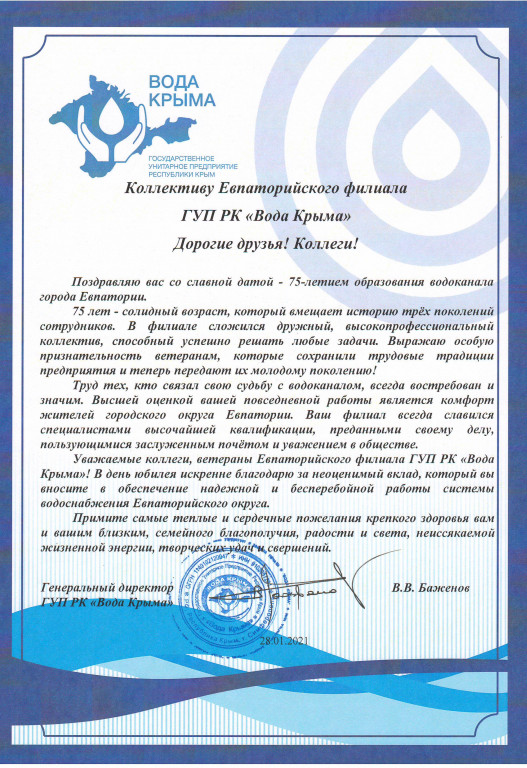 Руководство ГУП РК "Вода Крыма" в лице генерального директора Владимира Баженова поздравляет весь трудовой коллектив Евпаторийского филиала с юбилеем и желает всем крепкого здоровья, благополучия, профессиональных успехов, мира, согласия и добра!