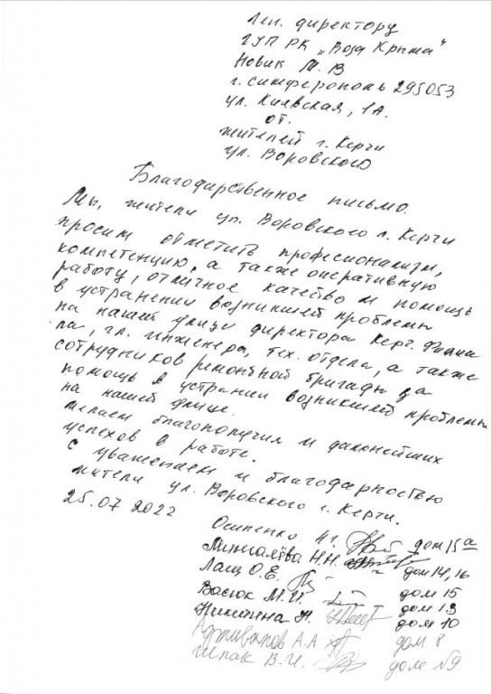 Так, жители ул. Воровского г. Керчи благодарят работников Керченского филиала ГУП РК «Вода Крыма» за оперативное решение проблемы с водоподачей на улице.
