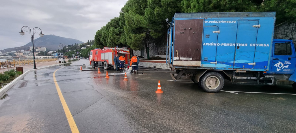 Для откачки воды были привлечены силы местного отделения МЧС. Для устранения повреждения трубы были привлечены 3 бригады АВР, в том числе 1 бригада Симферопольского филиала.