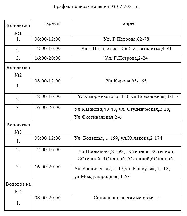 На период производства работ силами Керченского филиала ГУП РК "Вода Крыма" 03.02.2021 будет дополнительно осуществляться подвоз питьевой воды специализированным автотранспортом согласно графику.