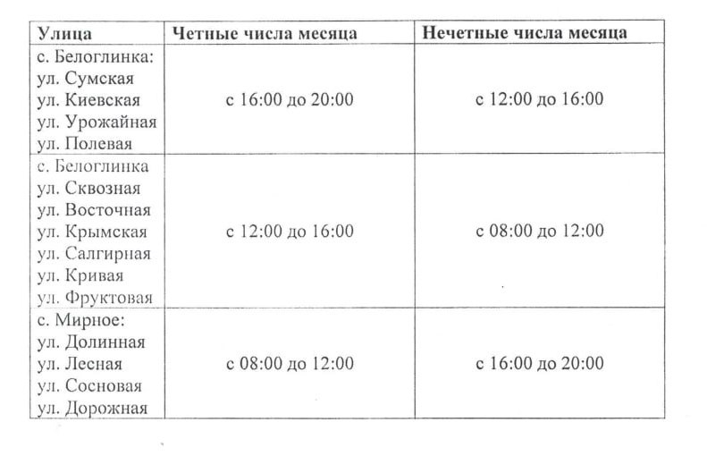 В связи с резким снижением дебита скважины с 8 августа 2024 года подача воды в селах будет осуществляться по утвержденному главой администрации Симферопольского района графику: