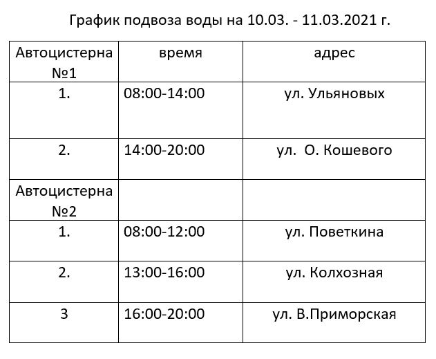 Напоминаем, что с 20-00 09.03.2021 г. до 06-00 12.03.2021 г. в связи с производством аварийно-восстановительных работ на Телецентровских резервуарах, связанных с ремонтом 4 резервуара и запорной арматуры д.500 мм, будет ограничено водоснабжение домов по следующим адресам: ул.Поветкина, ул.Ульяновых, ул. Колхозная, ул. В Приморская, ул. О.Кошевого, ул. Мухлынина .